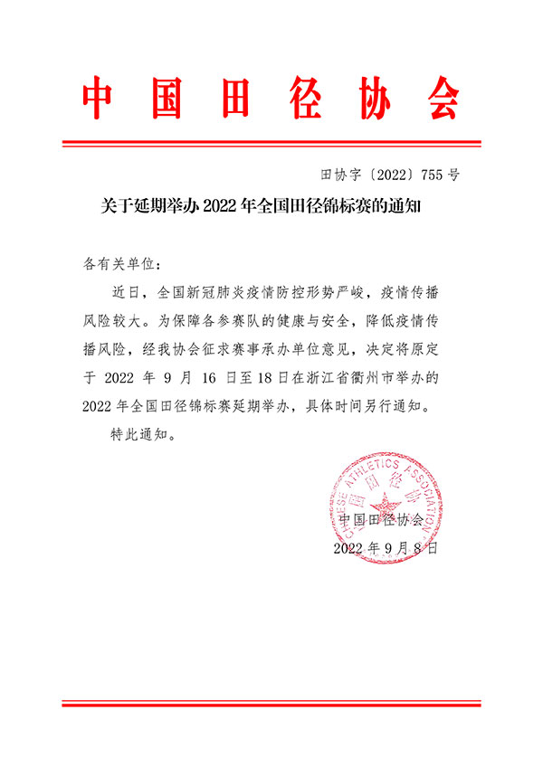 2026-03-15本次通知指出因新冠疫情防控形势影响,全国田本次通知指出,受当前新冠疫情防控形势的影响,为确保参赛队伍的健康与安全,赛事主办方与承办单位在充分协商后决定将原定的全国田径锦标赛延期举... -