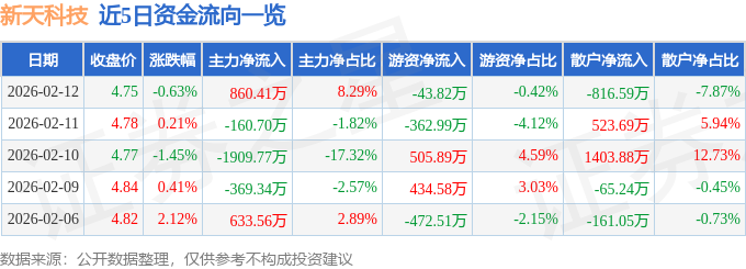 证券之星消息,截至2026年2月12日收盘,新天科技(300259)报收于4.75元,下跌0.63%,换手率1.86%,成交量21.77万手,成交额1.04亿元。