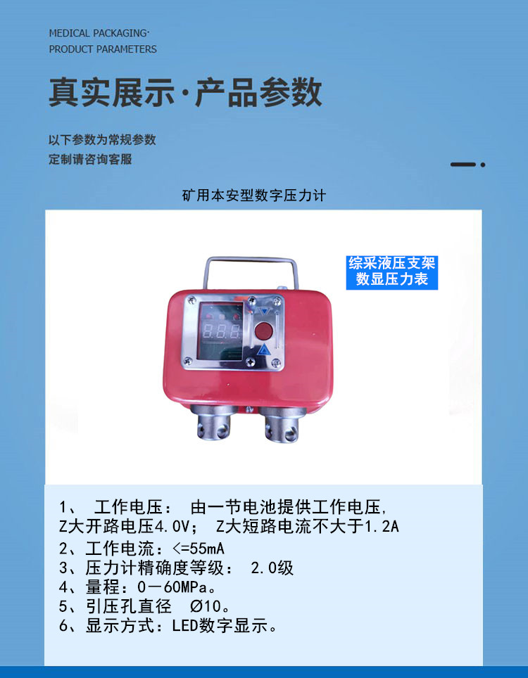 YHY60本安型数字压力计由高强度、抗静电外壳和高性能抗震压力表组成,具有体积小、重量轻、使用方便、显示直观、可长期在井下使用,无需维护等特点。